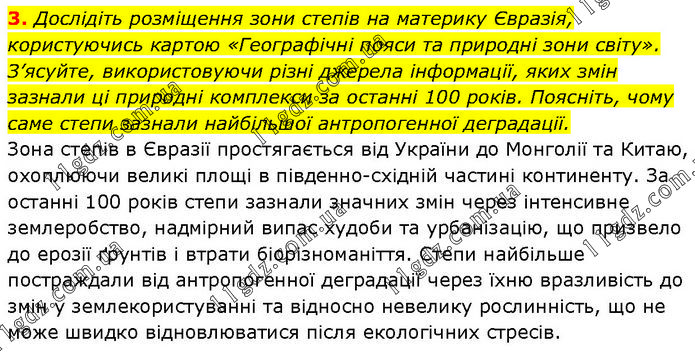 Дослідіть розміщення зони степів на материку Євразія, користуючись картою «Географічні пояси та природні зони світу». З’ясуйте, використовуючи різні джерела інформації, яких змін зазнали ці природні комплекси за останні 100 років. Поясніть, чому саме степи зазнали найбільшої антропогенної деградації. Зона степів в Євразії простягається від України до Монголії та Китаю, охоплюючи великі площі в південно-східній частині континенту. За останні 100 років степи зазнали значних змін через інтенсивне землеробство, надмірний випас худоби та урбанізацію, що призвело до ерозії ґрунтів і втрати біорізноманіття. Степи найбільше постраждали від антропогенної деградації через їхню вразливість до змін у землекористуванні та відносно невелику рослинність, що не може швидко відновлюватися після екологічних стресів.