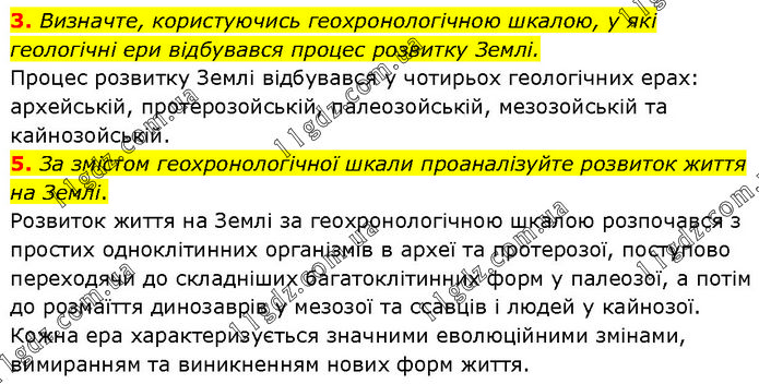 3. Визначте, користуючись геохронологічною шкалою, у які геологічні ери відбувався процес розвитку Землі. Процес розвитку Землі відбувався у чотирьох геологічних ерах: архейській, протерозойській, палеозойській, мезозойській та кайнозойській. 5. За змістом геохронологічної шкали проаналізуйте розвиток життя на Землі. Розвиток життя на Землі за геохронологічною шкалою розпочався з простих одноклітинних організмів в археї та протерозої, поступово переходячи до складніших багатоклітинних форм у палеозої, а потім до розмаїття динозаврів у мезозої та ссавців і людей у кайнозої. Кожна ера характеризується значними еволюційними змінами, вимиранням та виникненням нових форм життя.
