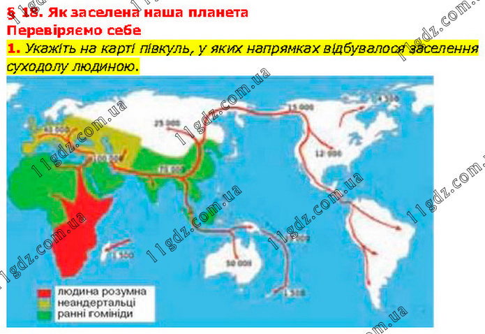§ 18. Як заселена наша планета Перевіряємо себе 1. Укажіть на карті півкуль, у яких напрямках відбувалося заселення суходолу людиною.