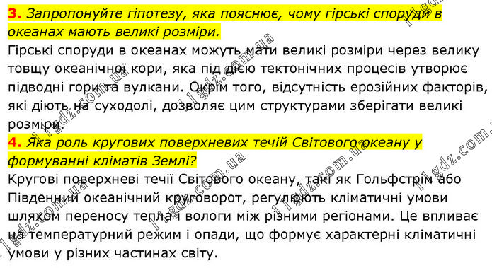 3. Запропонуйте гіпотезу, яка пояснює, чому гірські споруди в океанах мають великі розміри. Гірські споруди в океанах можуть мати великі розміри через велику товщу океанічної кори, яка під дією тектонічних процесів утворює підводні гори та вулкани. Окрім того, відсутність ерозійних факторів, які діють на суходолі, дозволяє цим структурами зберігати великі розміри. 4. Яка роль кругових поверхневих течій Світового океану у формуванні кліматів Землі? Кругові поверхневі течії Світового океану, такі як Гольфстрім або Південний океанічний круговорот, регулюють кліматичні умови шляхом переносу тепла і вологи між різними регіонами. Це впливає на температурний режим і опади, що формує характерні кліматичні умови у різних частинах світу.