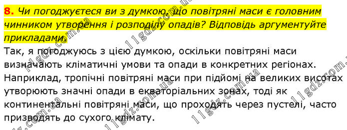 Чи погоджуєтеся ви з думкою, що повітряні маси є головним чинником утворення і розподілу опадів? Відповідь аргументуйте прикладами. Так, я погоджуюсь з цією думкою, оскільки повітряні маси визначають кліматичні умови та опади в конкретних регіонах. Наприклад, тропічні повітряні маси при підйомі на великих висотах утворюють значні опади в екваторіальних зонах, тоді як континентальні повітряні маси, що проходять через пустелі, часто призводять до сухого клімату.
