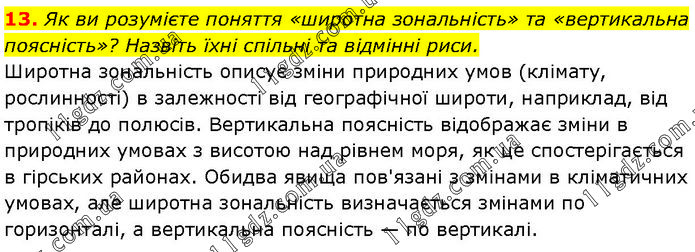 Як ви розумієте поняття «широтна зональність» та «вертикальна поясність»? Назвіть їхні спільні та відмінні риси. Широтна зональність описує зміни природних умов (клімату, рослинності) в залежності від географічної широти, наприклад, від тропіків до полюсів. Вертикальна поясність відображає зміни в природних умовах з висотою над рівнем моря, як це спостерігається в гірських районах. Обидва явища пов'язані з змінами в кліматичних умовах, але широтна зональність визначається змінами по горизонталі, а вертикальна поясність — по вертикалі.