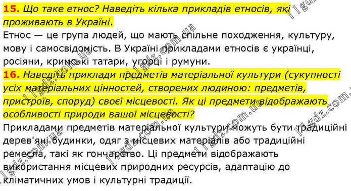 15. Що таке етнос? Наведіть кілька прикладів етносів, які проживають в Україні. Етнос — це група людей, що мають спільне походження, культуру, мову і самосвідомість. В Україні прикладами етносів є українці, росіяни, кримські татари, угорці і румуни. 16. Наведіть приклади предметів матеріальної культури (сукупності усіх матеріальних цінностей, створених людиною: предметів, пристроїв, споруд) своєї місцевості. Як ці предмети відображають особливості природи вашої місцевості? Прикладами предметів матеріальної культури можуть бути традиційні дерев'яні будинки, одяг з місцевих матеріалів або традиційні ремесла, такі як гончарство. Ці предмети відображають використання місцевих природних ресурсів, адаптацію до кліматичних умов і культурні традиції.
