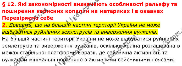 § 12. Які закономірності визначають особливості рельєфу та поширення корисних копалин на материках і в океанах Перевіряємо себе 2. Доведіть, що на більшій частині території України не може відбуватися руйнівних землетрусів та виверження вулканів. На більшій частині території України не може відбуватися руйнівних землетрусів та виверження вулканів, оскільки країна розташована в межах стабільної платформи Євразії, де сейсмічна активність та вулканізм мінімальні порівняно з активними сейсмічними поясами.