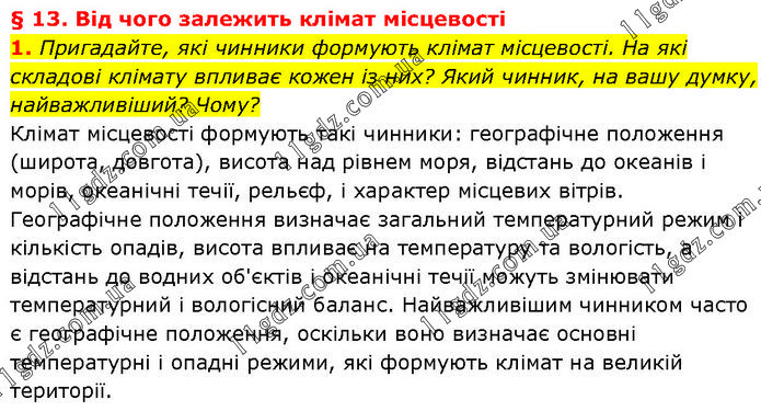 § 13. Від чого залежить клімат місцевості 1. Пригадайте, які чинники формують клімат місцевості. На які складові клімату впливає кожен із них? Який чинник, на вашу думку, найважливіший? Чому? Клімат місцевості формують такі чинники: географічне положення (широта, довгота), висота над рівнем моря, відстань до океанів і морів, океанічні течії, рельєф, і характер місцевих вітрів. Географічне положення визначає загальний температурний режим і кількість опадів, висота впливає на температуру та вологість, а відстань до водних об'єктів і океанічні течії можуть змінювати температурний і вологісний баланс. Найважливішим чинником часто є географічне положення, оскільки воно визначає основні температурні і опадні режими, які формують клімат на великій території.
