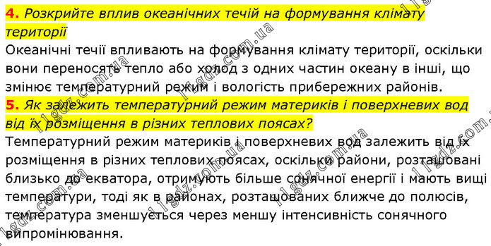 4. Розкрийте вплив океанічних течій на формування клімату території Океанічні течії впливають на формування клімату території, оскільки вони переносять тепло або холод з одних частин океану в інші, що змінює температурний режим і вологість прибережних районів. 5. Як залежить температурний режим материків і поверхневих вод від їх розміщення в різних теплових поясах? Температурний режим материків і поверхневих вод залежить від їх розміщення в різних теплових поясах, оскільки райони, розташовані близько до екватора, отримують більше сонячної енергії і мають вищі температури, тоді як в районах, розташованих ближче до полюсів, температура зменшується через меншу інтенсивність сонячного випромінювання.