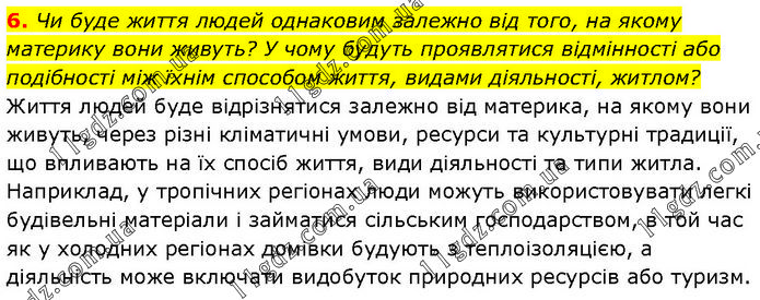 6. Чи буде життя людей однаковим залежно від того, на якому материку вони живуть? У чому будуть проявлятися відмінності або подібності між їхнім способом життя, видами діяльності, житлом? Життя людей буде відрізнятися залежно від материка, на якому вони живуть, через різні кліматичні умови, ресурси та культурні традиції, що впливають на їх спосіб життя, види діяльності та типи житла. Наприклад, у тропічних регіонах люди можуть використовувати легкі будівельні матеріали і займатися сільським господарством, в той час як у холодних регіонах домівки будують з теплоізоляцією, а діяльність може включати видобуток природних ресурсів або туризм.