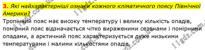 Які найхарактерніші ознаки кожного кліматичного поясу Північної Америки? Тропічний пояс має високу температуру і велику кількість опадів, помірний пояс відзначається чітко вираженими сезонами і помірними опадами, а арктичний пояс характеризується дуже низькими температурами і малими кількостями опадів.