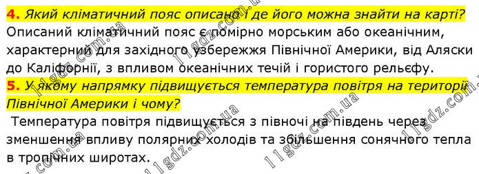 4. Який кліматичний пояс описано і де його можна знайти на карті? Описаний кліматичний пояс є помірно морським або океанічним, характерний для західного узбережжя Північної Америки, від Аляски до Каліфорнії, з впливом океанічних течій і гористого рельєфу. 5. У якому напрямку підвищується температура повітря на території Північної Америки і чому? Температура повітря підвищується з півночі на південь через зменшення впливу полярних холодів та збільшення сонячного тепла в тропічних широтах.