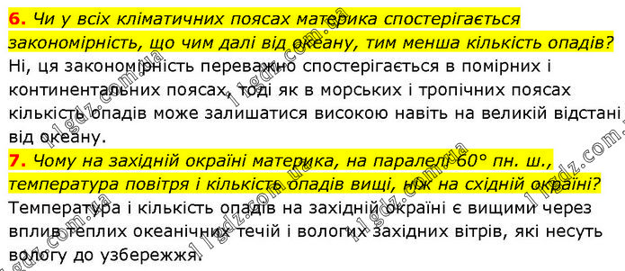 6. Чи у всіх кліматичних поясах материка спостерігається закономірність, що чим далі від океану, тим менша кількість опадів? Ні, ця закономірність переважно спостерігається в помірних і континентальних поясах, тоді як в морських і тропічних поясах кількість опадів може залишатися високою навіть на великій відстані від океану. 7. Чому на західній окраїні материка, на паралелі 60° пн. ш., температура повітря і кількість опадів вищі, ніж на східній окраїні? Температура і кількість опадів на західній окраїні є вищими через вплив теплих океанічних течій і вологих західних вітрів, які несуть вологу до узбережжя.