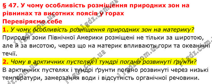 § 47. У чому особливість розміщення природних зон на рівнинах та висотних поясів у горах Перевіряємо себе 1. У чому особливість розміщення природних зон на материку? Природні зони Північної Америки розміщені не тільки за широтою, але й за висотою, через що на материк впливають гори та океанічні течії. 2. Чому в арктичних пустелях і тундрі погано розвинуті ґрунти? В арктичних пустелях і тундрі ґрунти погано розвинуті через низькі температури, замерзання води і відсутність органічної речовини.