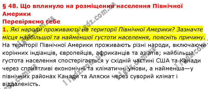 § 48. Що вплинуло на розміщення населення Північної Америки Перевіряємо себе 1. Які народи проживають на території Північної Америки? Зазначте місця найбільшої та найменшої густоти населення, поясніть причину. На території Північної Америки проживають різні народи, включаючи корінних індіанців, європейців, африканців та азіатів; найбільша густота населення спостерігається у східній частині США та Канади через сприятливі економічні та кліматичні умови, а найменша—у північних районах Канади та Аляски через суворий клімат і віддаленість.