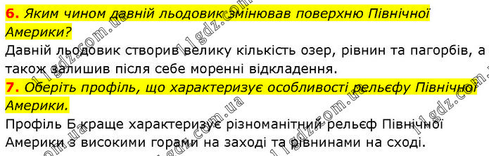 6. Яким чином давній льодовик змінював поверхню Північної Америки? Давній льодовик створив велику кількість озер, рівнин та пагорбів, а також залишив після себе моренні відкладення. 7. Оберіть профіль, що характеризує особливості рельєфу Північної Америки. Профіль Б краще характеризує різноманітний рельєф Північної Америки з високими горами на заході та рівнинами на сході.