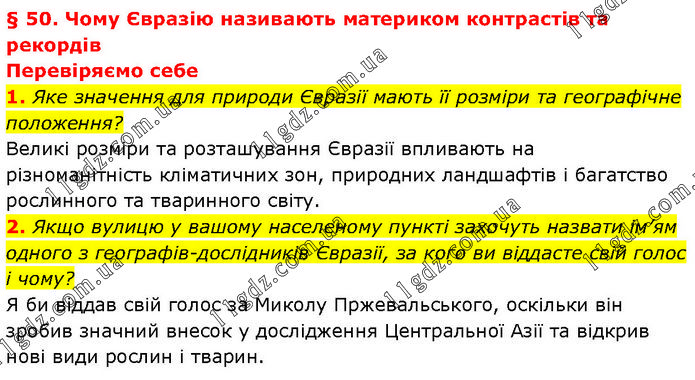 § 50. Чому Євразію називають материком контрастів та рекордів Перевіряємо себе 1. Яке значення для природи Євразії мають її розміри та географічне положення? Великі розміри та розташування Євразії впливають на різноманітність кліматичних зон, природних ландшафтів і багатство рослинного та тваринного світу. 2. Якщо вулицю у вашому населеному пункті захочуть назвати ім’ям одного з географів-дослідників Євразії, за кого ви віддасте свій голос і чому? Я би віддав свій голос за Миколу Пржевальського, оскільки він зробив значний внесок у дослідження Центральної Азії та відкрив нові види рослин і тварин.