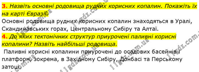 3. Назвіть основні родовища рудних корисних копалин. Покажіть їх на карті Євразії. Основні родовища рудних корисних копалин знаходяться в Уралі, Скандинавських горах, Центральному Сибіру та Алтаї. 4. До яких тектонічних структур приурочені паливні корисні копалини? Назвіть найбільші родовища. Паливні корисні копалини приурочені до осадових басейнів і платформ, зокрема, в Західному Сибіру, Донбасі та Перському затоці.