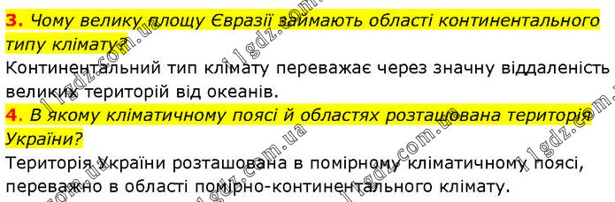 3. Чому велику площу Євразії займають області континентального типу клімату? Континентальний тип клімату переважає через значну віддаленість великих територій від океанів. 4. В якому кліматичному поясі й областях розташована територія України? Територія України розташована в помірному кліматичному поясі, переважно в області помірно-континентального клімату.