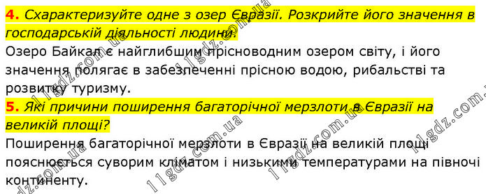 4. Схарактеризуйте одне з озер Євразії. Розкрийте його значення в господарській діяльності людини. Озеро Байкал є найглибшим прісноводним озером світу, і його значення полягає в забезпеченні прісною водою, рибальстві та розвитку туризму. 5. Які причини поширення багаторічної мерзлоти в Євразії на великій площі? Поширення багаторічної мерзлоти в Євразії на великій площі пояснюється суворим кліматом і низькими температурами на півночі континенту.