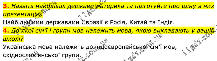 3. Назвіть найбільші держави материка та підготуйте про одну з них презентацію. Найбільшими державами Євразії є Росія, Китай та Індія. 4. До якої сім’ї і групи мов належить мова, якою викладають у вашій школі? Українська мова належить до індоєвропейської сім’ї мов, східнослов’янської групи.