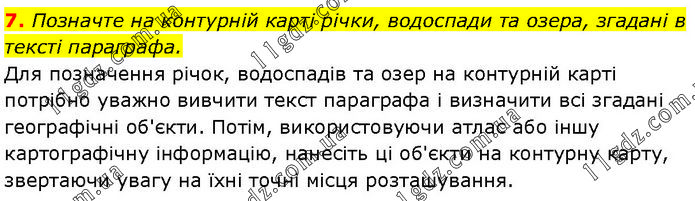 7. Позначте на контурній карті річки, водоспади та озера, згадані в тексті параграфа. Для позначення річок, водоспадів та озер на контурній карті потрібно уважно вивчити текст параграфа і визначити всі згадані географічні об'єкти. Потім, використовуючи атлас або іншу картографічну інформацію, нанесіть ці об'єкти на контурну карту, звертаючи увагу на їхні точні місця розташування.