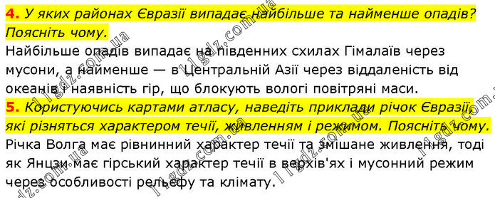 4. У яких районах Євразії випадає найбільше та найменше опадів? Поясніть чому. Найбільше опадів випадає на південних схилах Гімалаїв через мусони, а найменше — в Центральній Азії через віддаленість від океанів і наявність гір, що блокують вологі повітряні маси. 5. Користуючись картами атласу, наведіть приклади річок Євразії, які різняться характером течії, живленням і режимом. Поясніть чому. Річка Волга має рівнинний характер течії та змішане живлення, тоді як Янцзи має гірський характер течії в верхів'ях і мусонний режим через особливості рельєфу та клімату.