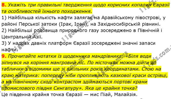 8. Укажіть три правильні твердження щодо корисних копалин Євразії та особливостей їхнього походження. 1) Найбільша кількість нафти залягає на Аравійському півострові, у районі Перської затоки (Ірак, Іран), на Західносибірській рівнині. 2) Найбільші родовища природного газу зосереджено в Північній і Центральній Азії. 3) У надрах давніх платформ Євразії зосереджені значні запаси нафти. 9. Прочитайте нотатки із щоденника мандрівника: «Біля води зіпнувся на коріння мангровий ліс. По місточках можна дійти до таблички з відомими ще зі шкільних років координатами. Стою на краю материка: попереду ніби пропливають казкової краси острівці, а на північному сході контрастом здіймаються портові крани промислового півдня Сингапуру». Яка це крайня точка? Це південна крайня точка Євразії — мис Піай, Малайзія.