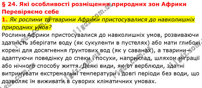 § 24. Які особливості розміщення природних зон Африки Перевіряємо себе 1. Як рослини та тварини Африки пристосувалися до навколишніх природних умов? Рослини Африки пристосувалися до навколишніх умов, розвиваючи здатність зберігати воду (як сукуленти в пустелях) або мати глибокі корені для досягнення ґрунтових вод (як у саванах), а тварини—адаптуючи поведінку до спеки і посухи, наприклад, шляхом міграції або нічного способу життя. Деякі види, як-от верблюди, здатні витримувати екстремальні температури і довгі періоди без води, що дозволяє їм виживати в суворих кліматичних умовах.