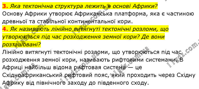 3. Яка тектонічна структура лежить в основі Африки? Основу Африки утворює Африканська платформа, яка є частиною древньої та стабільної континентальної кори. 4. Як називають лінійно витягнуті тектонічні розломи, що утворюються під час розходження земної кори? Де вони розташовані? Лінійно витягнуті тектонічні розломи, що утворюються під час розходження земної кори, називають рифтовими системами. В Африці найбільш відома рифтовая система — це Східноафриканський рифтовий пояс, який проходить через Східну Африку від північного заходу до південного сходу.