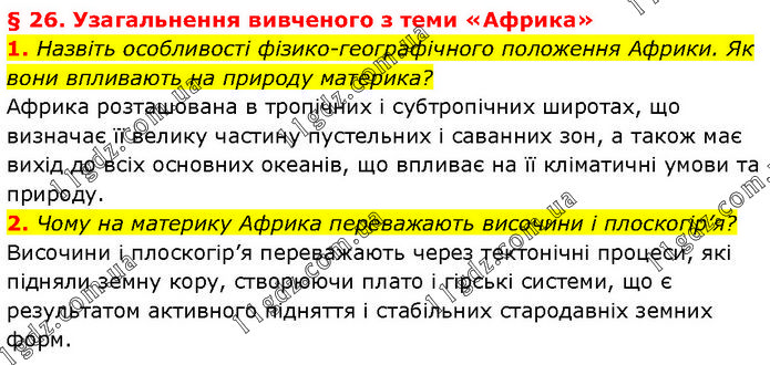 § 26. Узагальнення вивченого з теми «Африка» 1. Назвіть особливості фізико-географічного положення Африки. Як вони впливають на природу материка? Африка розташована в тропічних і субтропічних широтах, що визначає її велику частину пустельних і саванних зон, а також має вихід до всіх основних океанів, що впливає на її кліматичні умови та природу. 2. Чому на материку Африка переважають височини і плоскогір’я? Височини і плоскогір’я переважають через тектонічні процеси, які підняли земну кору, створюючи плато і гірські системи, що є результатом активного підняття і стабільних стародавніх земних форм.