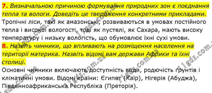 7. Визначальною причиною формування природних зон є поєднання тепла та вологи. Доведіть це твердження конкретними прикладами. Тропічні ліси, такі як амазонські, розвиваються в умовах постійного тепла і високої вологості, тоді як пустелі, як Сахара, мають високу температуру і низьку вологість, що обумовлює їхні сухі умови. 8. Назвіть чинники, що впливають на розміщення населення на території материка. Назвіть відомі вам держави Африки та їхні столиці. Основні чинники включають доступність води, родючість ґрунтів і кліматичні умови. Відомі країни: Єгипет (Каїр), Нігерія (Абуджа), Південноафриканська Республіка (Преторія).