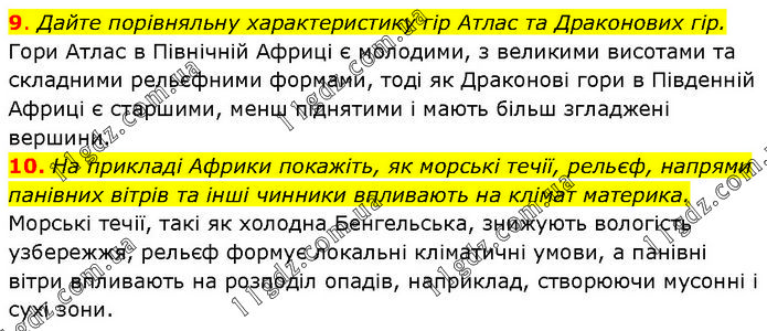 9. Дайте порівняльну характеристику гір Атлас та Драконових гір. Гори Атлас в Північній Африці є молодими, з великими висотами та складними рельєфними формами, тоді як Драконові гори в Південній Африці є старшими, менш піднятими і мають більш згладжені вершини. 10. На прикладі Африки покажіть, як морські течії, рельєф, напрями панівних вітрів та інші чинники впливають на клімат материка. Морські течії, такі як холодна Бенгельська, знижують вологість узбережжя, рельєф формує локальні кліматичні умови, а панівні вітри впливають на розподіл опадів, наприклад, створюючи мусонні і сухі зони.