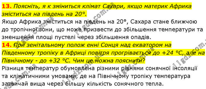 13. Поясніть, я к зміниться клімат Сахари, якщо материк Африка зміститься на південь на 20°. Якщо Африка зміститься на південь на 20°, Сахара стане ближчою до тропічної зони, що може призвести до збільшення температури та зменшення площі пустелі через збільшення опадів. 14. При зенітальному полож енні Сонця над екватором на Південному тропіку в Африці повітря прогрівається до +24 °С, але на Північному - до +32 °С. Чим це можна пояснити? Різниця температур обумовлена різними рівнями сонячної інсоляції та кліматичними умовами, де на Північному тропіку температура зазвичай вища через більшу кількість сонячного тепла.