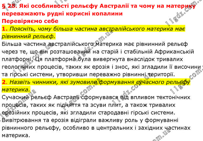 § 28. Які особливості рельєфу Австралії та чому на материку переважають рудні корисні копалини Перевіряємо себе 1. Поясніть, чому більша частина австралійського материка має рівнинний рельєф. Більша частина австралійського материка має рівнинний рельєф через те, що він розташований на старій і стабільній Африканській платформі. Ця платформа була вивергнута внаслідок тривалих геологічних процесів, таких як ерозія і знос, які згладили її височини та гірські системи, утворивши переважно рівнинні території. 2. Назвіть чинники, які зумовили формування сучасного рельєфу материка. Сучасний рельєф Австралії сформувався під впливом тектонічних процесів, таких як підняття та зсуви плит, а також тривалих ерозійних процесів, які згладили стародавні гірські системи. Вивітрювання та ерозія відіграли важливу роль у формуванні рівнинного рельєфу, особливо в центральних і західних частинах материка.