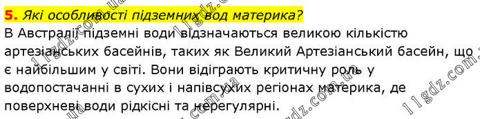 5. Які особливості підземних вод материка? В Австралії підземні води відзначаються великою кількістю артезіанських басейнів, таких як Великий Артезіанський басейн, що є найбільшим у світі. Вони відіграють критичну роль у водопостачанні в сухих і напівсухих регіонах материка, де поверхневі води рідкісні та нерегулярні.