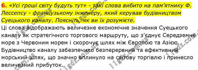 «Усі гроші світу будуть тут» - такі слова вибито на пам’ятнику Ф. Лессепсу - французькому інженеру, який керував будівництвом Суецького каналу. Поясніть, як ви їх розумієте. Ці слова відображають величезне економічне значення Суецького каналу як стратегічного торгового маршруту, що з'єднує Середземне море з Червоним морем і скорочує шлях між Європою та Азією. Будівництво каналу забезпечило безперервний та ефективний морський шлях, що значно вплинуло на світову торгівлю і принесло величезний прибуток.