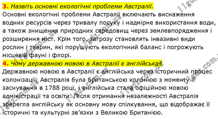 3. Назвіть основні екологічні проблеми Австралії. Основні екологічні проблеми Австралії включають виснаження водних ресурсів через тривалу посуху і надмірне використання води, а також знищення природних середовищ через землевпорядження і розширення міст. Крім того, загрозу становлять інвазивні види рослин і тварин, які порушують екологічний баланс і погрожують місцевій фауні і флорі. 4. Чому державною мовою в Австралії є англійська? Державною мовою в Австралії є англійська через історичний процес колонізації: Австралія була британською колонією з моменту її заснування в 1788 році, і англійська стала офіційною мовою адміністрації та освіти. Після отримання незалежності Австралія зберегла англійську як основну мову спілкування, що відображає її історичні та культурні зв’язки з Великою Британією.