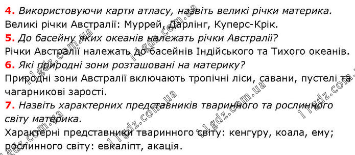 4. Використовуючи карти атласу, назвіть великі річки материка. Великі річки Австралії: Муррей, Дарлінг, Куперс-Крік. 5. До басейну яких океанів належать річки Австралії? Річки Австралії належать до басейнів Індійського та Тихого океанів. 6. Які природні зони розташовані на материку? Природні зони Австралії включають тропічні ліси, савани, пустелі та чагарникові зарості. 7. Назвіть характерних представників тваринного та рослинного світу материка. Характерні представники тваринного світу: кенгуру, коала, ему; рослинного світу: евкаліпт, акація.