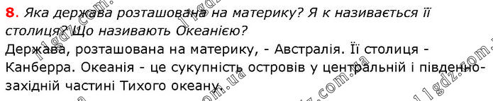 Яка держава розташована на материку? Я к називається її столиця? Що називають Океанією? Держава, розташована на материку, - Австралія. Її столиця - Канберра. Океанія - це сукупність островів у центральній і південно-західній частині Тихого океану.