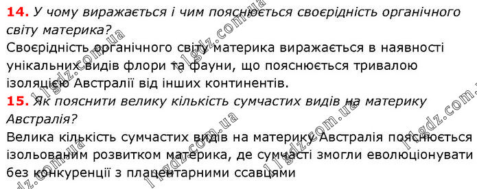 14. У чому виражається і чим пояснюється своєрідність органічного світу материка? Своєрідність органічного світу материка виражається в наявності унікальних видів флори та фауни, що пояснюється тривалою ізоляцією Австралії від інших континентів. 15. Як пояснити велику кількість сумчастих видів на материку Австралія? Велика кількість сумчастих видів на материку Австралія пояснюється ізольованим розвитком материка, де сумчасті змогли еволюціонувати без конкуренції з плацентарними ссавцями.