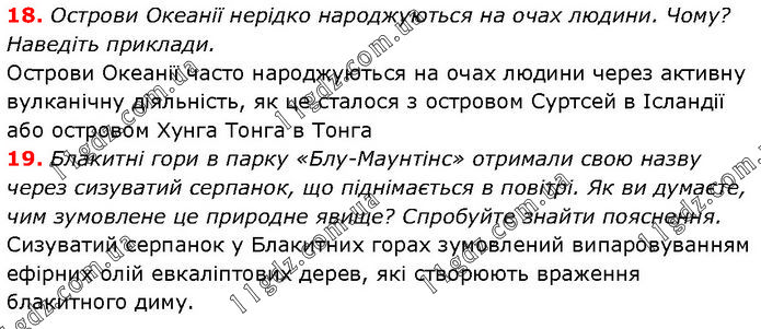 18. Острови Океанії нерідко народжуються на очах людини. Чому? Наведіть приклади. Острови Океанії часто народжуються на очах людини через активну вулканічну діяльність, як це сталося з островом Суртсей в Ісландії або островом Хунга Тонга в Тонга. 19. Блакитні гори в парку «Блу-Маунтінс» отримали свою назву через сизуватий серпанок, що піднімається в повітрі. Як ви думаєте, чим зумовлене це природне явище? Спробуйте знайти пояснення. Сизуватий серпанок у Блакитних горах зумовлений випаровуванням ефірних олій евкаліптових дерев, які створюють враження блакитного диму.