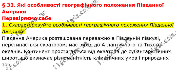 § 33. Які особливості географічного положення Південної Америки Перевіряємо себе 1. Схарактеризуйте особливості географічного положення Південної Америки. Південна Америка розташована переважно в Південній півкулі, перетинається екватором, має вихід до Атлантичного та Тихого океанів. Континент простягається від екватора до субантарктичних широт, що визначає різноманітність кліматичних умов і природних зон.