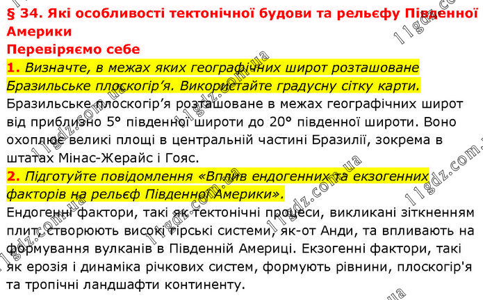 § 34. Які особливості тектонічної будови та рельєфу Південної Америки Перевіряємо себе 1. Визначте, в межах яких географічних широт розташоване Бразильське плоскогір’я. Використайте градусну сітку карти. Бразильське плоскогір’я розташоване в межах географічних широт від приблизно 5° південної широти до 20° південної широти. Воно охоплює великі площі в центральній частині Бразилії, зокрема в штатах Мінас-Жерайс і Гояс. 2. Підготуйте повідомлення «Вплив ендогенних та екзогенних факторів на рельєф Південної Америки». Ендогенні фактори, такі як тектонічні процеси, викликані зіткненням плит, створюють високі гірські системи, як-от Анди, та впливають на формування вулканів в Південній Америці. Екзогенні фактори, такі як ерозія і динаміка річкових систем, формують рівнини, плоскогір'я та тропічні ландшафти континенту.