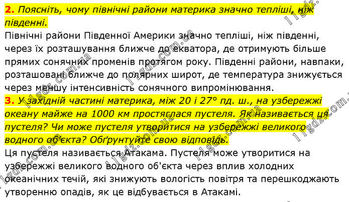 2. Поясніть, чому північні райони материка значно тепліші, ніж південні. Північні райони Південної Америки значно тепліші, ніж південні, через їх розташування ближче до екватора, де отримують більше прямих сонячних променів протягом року. Південні райони, навпаки, розташовані ближче до полярних широт, де температура знижується через меншу інтенсивність сонячного випромінювання. 3. У західній частині материка, між 20 і 27° пд. ш., на узбережжі океану майже на 1000 км простяглася пустеля. Як називається ця пустеля? Чи може пустеля утворитися на узбережжі великого водного об’єкта? Обґрунтуйте свою відповідь. Ця пустеля називається Атакама. Пустеля може утворитися на узбережжі великого водного об'єкта через вплив холодних океанічних течій, які знижують вологість повітря та перешкоджають утворенню опадів, як це відбувається в Атакамі.