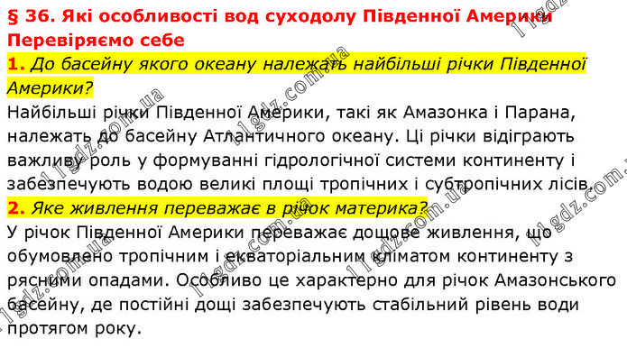 § 36. Які особливості вод суходолу Південної Америки Перевіряємо себе 1. До басейну якого океану належать найбільші річки Південної Америки? Найбільші річки Південної Америки, такі як Амазонка і Парана, належать до басейну Атлантичного океану. Ці річки відіграють важливу роль у формуванні гідрологічної системи континенту і забезпечують водою великі площі тропічних і субтропічних лісів. 2. Яке живлення переважає в річок материка? У річок Південної Америки переважає дощове живлення, що обумовлено тропічним і екваторіальним кліматом континенту з рясними опадами. Особливо це характерно для річок Амазонського басейну, де постійні дощі забезпечують стабільний рівень води протягом року.