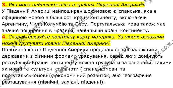 3. Яка мова найпоширеніша в країнах Південної Америки? У Південній Америці найпоширенішою мовою є іспанська, яка є офіційною мовою в більшості країн континенту, включаючи Аргентину, Чилі, Колумбію та Перу. Португальська мова також має значне поширення в Бразилії, найбільшій країні континенту. 4. Схарактеризуйте політичну карту материка. За якими ознаками можна групувати країни Південної Америки? Політична карта Південної Америки представлена незалежними державами з різними формами урядування, серед яких домінують республіки. Країни континенту можна групувати за ознаками, такими як мовні та культурні спільноти (іспанськомовні та португальськомовні), економічний розвиток, або географічне розташування (північні, західні, південні).