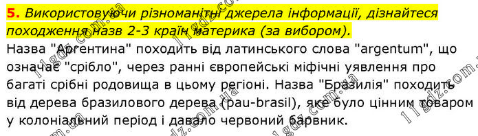 Використовуючи різноманітні джерела інформації, дізнайтеся походження назв 2-3 країн материка (за вибором). Назва "Аргентина" походить від латинського слова "argentum", що означає "срібло", через ранні європейські міфічні уявлення про багаті срібні родовища в цьому регіоні. Назва "Бразилія" походить від дерева бразилового дерева (pau-brasil), яке було цінним товаром у колоніальний період і давало червоний барвник.