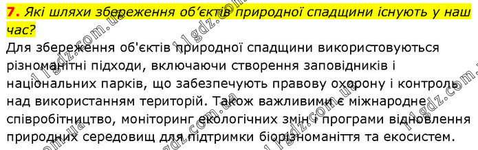Які шляхи збереження об’єктів природної спадщини існують у наш час? Для збереження об'єктів природної спадщини використовуються різноманітні підходи, включаючи створення заповідників і національних парків, що забезпечують правову охорону і контроль над використанням територій. Також важливими є міжнародне співробітництво, моніторинг екологічних змін і програми відновлення природних середовищ для підтримки біорізноманіття та екосистем.