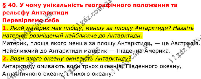 § 40. У чому унікальність географічного положення та рельєфу Антарктиди Перевіряємо себе 1. Який материк має площу, меншу за площу Антарктиди? Назвіть материк, розміщений найближче до Антарктиди. Материк, площа якого менша за площу Антарктиди, — це Австралія. Найближчий до Антарктиди материк — Південна Америка. 2. Води якого океану омивають Антарктиду? Антарктиду омивають води трьох океанів: Південного океану, Атлантичного океану, і Тихого океану.