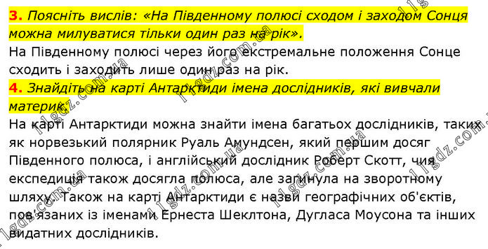 3. Поясніть вислів: «На Південному полюсі сходом і заходом Сонця можна милуватися тільки один раз на рік». На Південному полюсі через його екстремальне положення Сонце сходить і заходить лише один раз на рік. 4. Знайдіть на карті Антарктиди імена дослідників, які вивчали материк. На карті Антарктиди можна знайти імена багатьох дослідників, таких як норвезький полярник Руаль Амундсен, який першим досяг Південного полюса, і англійський дослідник Роберт Скотт, чия експедиція також досягла полюса, але загинула на зворотному шляху. Також на карті Антарктиди є назви географічних об'єктів, пов'язаних із іменами Ернеста Шеклтона, Дугласа Моусона та інших видатних дослідників.