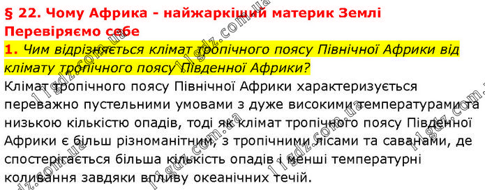 § 22. Чому Африка - найжаркіший материк Землі Перевіряємо себе 1. Чим відрізняється клімат тропічного поясу Північної Африки від клімату тропічного поясу Південної Африки? Клімат тропічного поясу Північної Африки характеризується переважно пустельними умовами з дуже високими температурами та низькою кількістю опадів, тоді як клімат тропічного поясу Південної Африки є більш різноманітним, з тропічними лісами та саванами, де спостерігається більша кількість опадів і менші температурні коливання завдяки впливу океанічних течій.