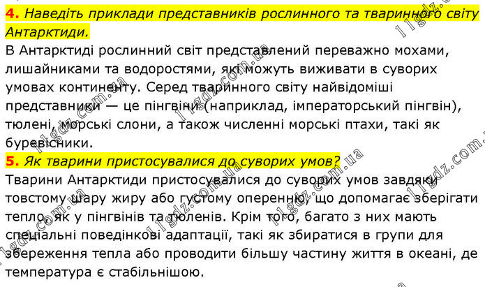 4. Наведіть приклади представників рослинного та тваринного світу Антарктиди. В Антарктиді рослинний світ представлений переважно мохами, лишайниками та водоростями, які можуть виживати в суворих умовах континенту. Серед тваринного світу найвідоміші представники — це пінгвіни (наприклад, імператорський пінгвін), тюлені, морські слони, а також численні морські птахи, такі як буревісники. 5. Як тварини пристосувалися до суворих умов? Тварини Антарктиди пристосувалися до суворих умов завдяки товстому шару жиру або густому оперенню, що допомагає зберігати тепло, як у пінгвінів та тюленів. Крім того, багато з них мають спеціальні поведінкові адаптації, такі як збиратися в групи для збереження тепла або проводити більшу частину життя в океані, де температура є стабільнішою.